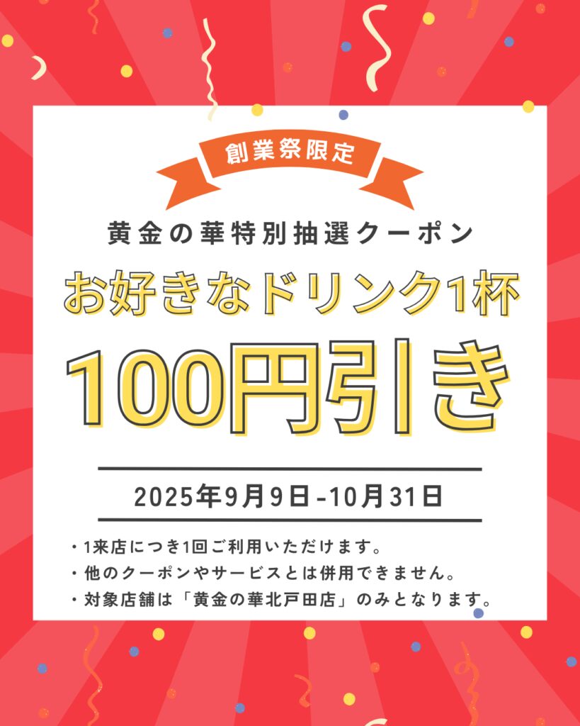 抽選で【ドリンク1杯100円引きクーポン】を配布。