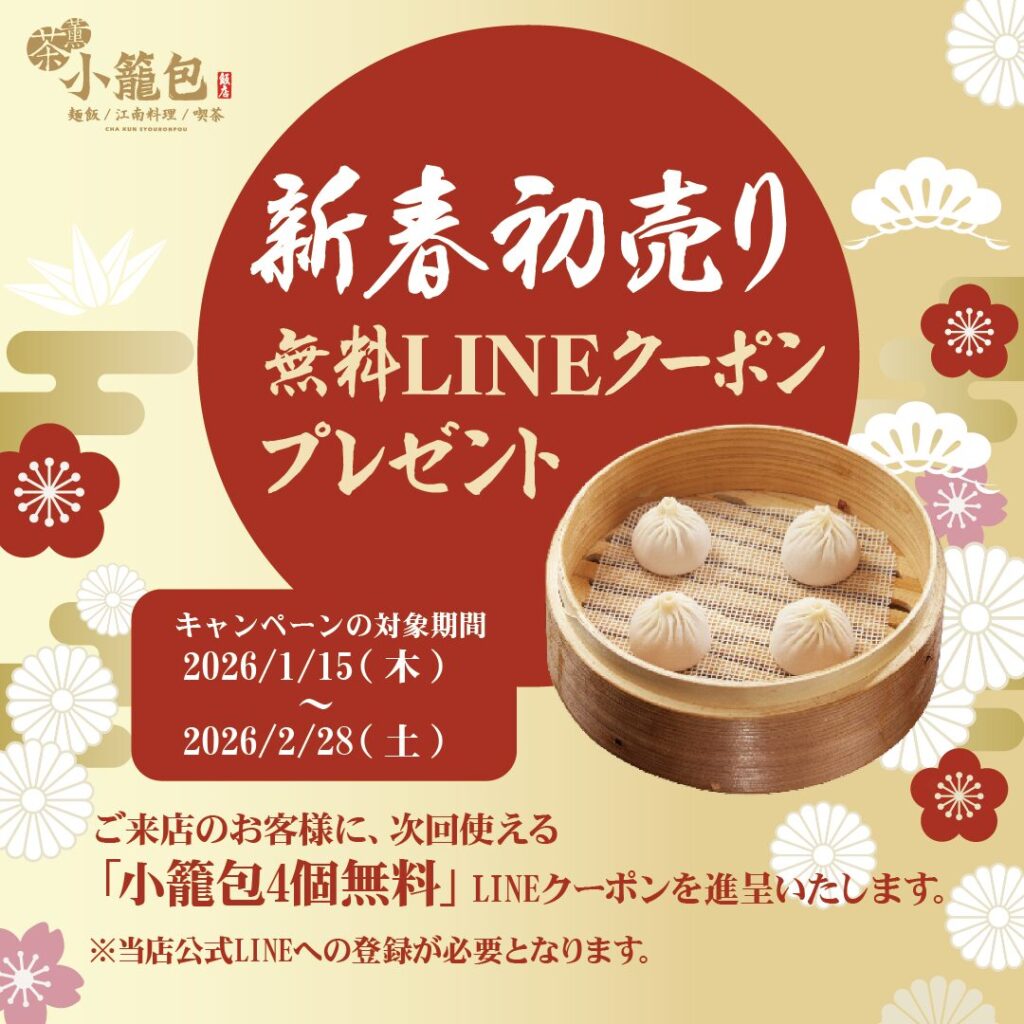 【茶薫小籠包】新春初売り!ご来店で「茶薫小籠包(4個)」無料クーポンプレゼントのお知らせ